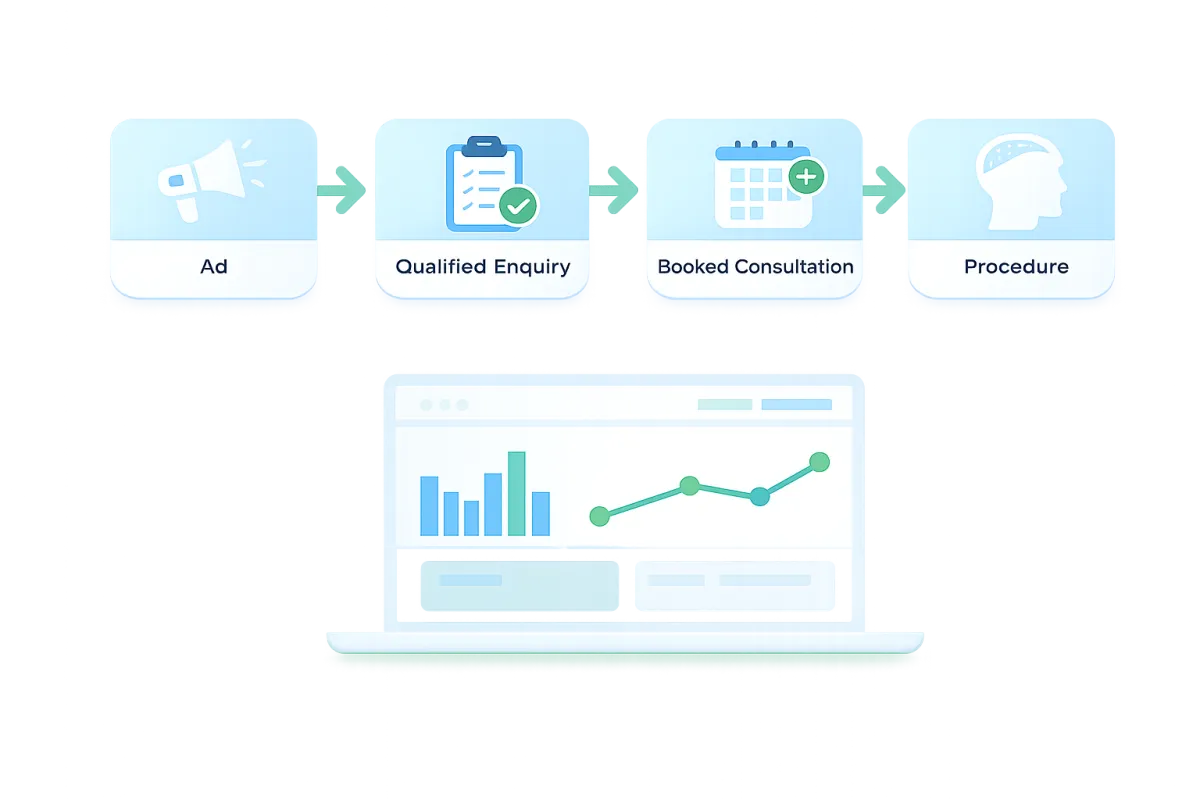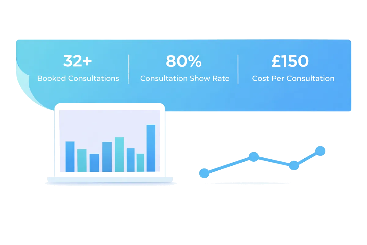 Our focus is on tangible consultation metrics. We track enquiry volume, cost per consultation, and show rates - continuously refining campaigns and follow-up systems to improve booked procedures and long-term predictability. With structured optimisation and clear reporting, performance becomes measurable and scalable.