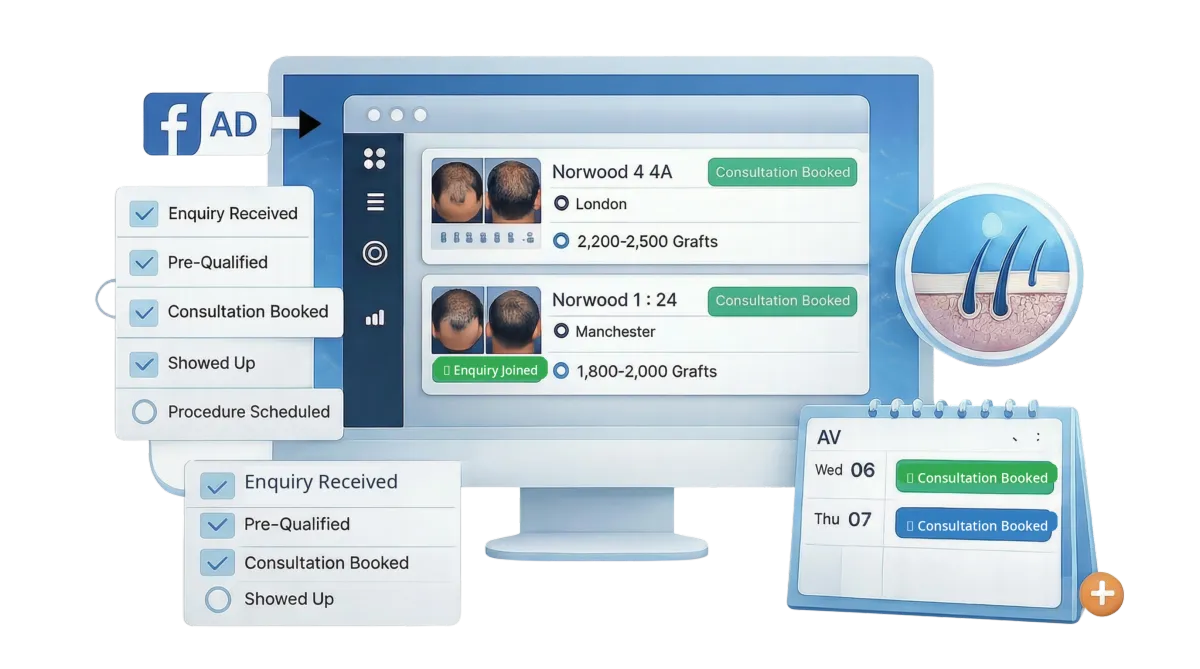 We optimise consultation volume, improve show rates, and increase scheduled procedures through structured patient acquisition systems built specifically for FUE & FUT clinics.